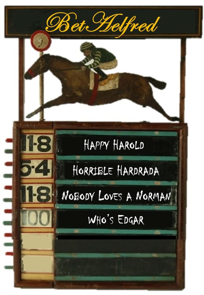A spokesperson for Bet Aelfred said that 83% of the bets on who would be crowned King were for Harold Godwinson, 11% of the bets were placed on Harald Hardrada, mainly drawing on his Northern supporters, 5% placed on Duke William, by those with an eye for a killing and 1% on the unknown Edgar the Atheling, a rank outsider.